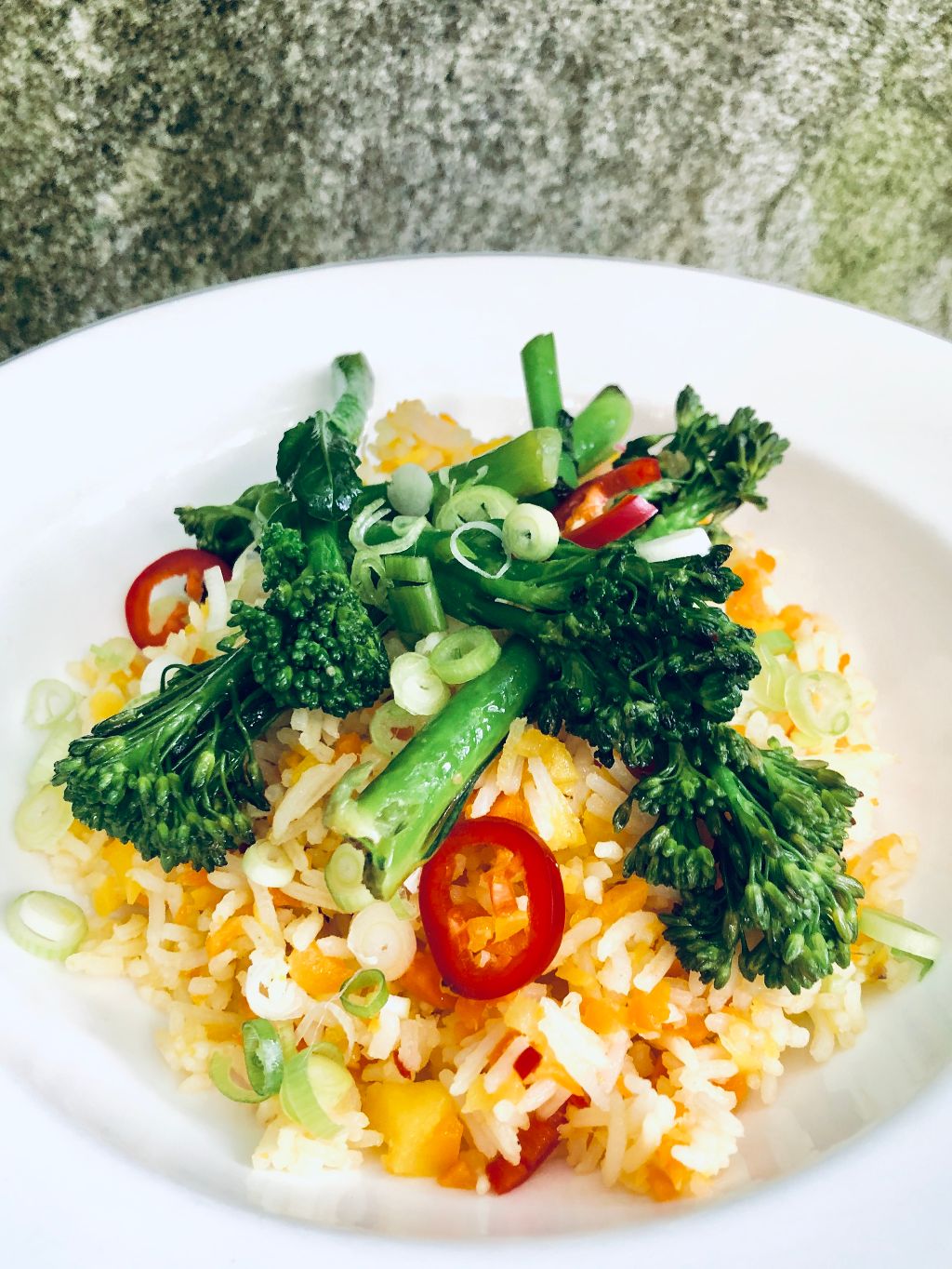 Gebruik 2 eetlepels kokosolie en laat heet worden in een koekenpan, roerbak de hurry curry 2 minuten.Voeg de wortel toe en bak lichtbruin, de knoflook, chili en gember mag er ook bij. Roerbak gedurende 2 minuten. Blancheer ondertussen de bimi groenten kort, zodat het nog lekker knapperig is.